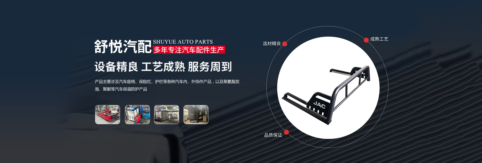 揚(yáng)州舒悅汽配有限公司經(jīng)過多年的穩(wěn)定發(fā)展,業(yè)績(jī)一直蒸蒸日上。公司產(chǎn)品主要涉及汽車座椅、保險(xiǎn)杠、護(hù)欄等各種汽車內(nèi)、外飾件產(chǎn)品,以及聚氨酯發(fā)泡、聚脲等汽車保溫防護(hù)產(chǎn)品。其主要是為江淮、金龍,奇瑞等公司服務(wù),已連續(xù)多年成為江淮、金龍等公司的A級(jí)供應(yīng)商。        公司成立于1997年,現(xiàn)坐落于揚(yáng)州市儀征劉集盤古工業(yè)集中區(qū)202號(hào),公司占地面積26640平 方米,廠房建筑面積18512平方米。公司擁有先進(jìn)的制造設(shè)備、可靠的生產(chǎn)工藝、完善的檢測(cè)手段和科學(xué)的管理,在售前和售后服務(wù)中做到快速反應(yīng),應(yīng)急應(yīng)變,為客戶提供優(yōu)良產(chǎn)品和滿意服務(wù)。公司的產(chǎn)品開發(fā)能力和生產(chǎn)規(guī)模在同行業(yè)中處于前列的地位。        揚(yáng)州舒悅?cè)吮小罢\信雙嬴”的原則,發(fā)揚(yáng)“誠信、務(wù)實(shí)、創(chuàng)新、貢獻(xiàn)”的企業(yè)精神,恪守“顧客至上”的經(jīng)營宗旨,致精從業(yè),不斷引進(jìn)新技術(shù)、新材料。以優(yōu)良的產(chǎn)品、合理的價(jià)格和周到的服務(wù)參與市場(chǎng)競(jìng)爭(zhēng)。公司愿與國內(nèi)外朋友建立真誠的合作伙伴關(guān)系,攜手共創(chuàng)輝煌!